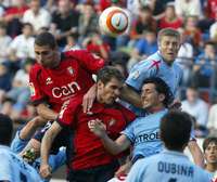 Los rojillos Carlos Javier Cu�ar y Jos�omero, en la f�ea lucha por el bal�on los rivales del Celta FOTO Reuters