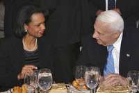 Condoleezza Rice, secretaria de Estado estadunidense, y Ariel Sharon, primer ministro israel�conversan durante una cena en Jerusal�FOTO Ap