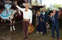 Ataviado con traje y sombrero de charro, con moño y botines, el presidente Vicente Fox arribó casi al mediodía al lienzo de Constituyentes para presenciar las competencias del trofeo Copa Presidencial -que llevó su nombre-, organizado por la Asociación Nacional de Charros.