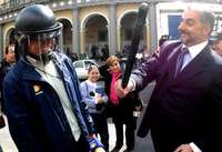 Molesto por los cuestionamientos, aseveró: ''No se puede hablar de represión o autoritarismo cuando se trata de defender la ley. La medida será violenta, pero desde la perspectiva de los manifestantes''.