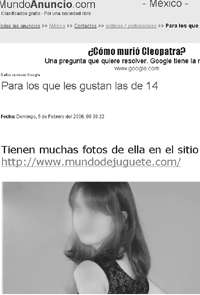 LO MAS GRACIOSO del anuncio es que, justo abajo de una de las fotos, se consigna, precedida de una señal de tránsito en inglés ("Stop"), esta leyenda: "MundoAnuncio.com apoya: Asociación Española contra la Pornografía Infantil".