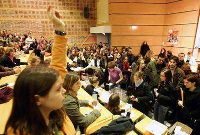 Votación de universitarios en Arras, al norte del país europeo, en la que decidieron sumarse hoy a la huelga general convocada por organizaciones sindicales y estudiantiles, a fin de ejercer mayor presión para que el gobierno dé marcha atrás a la reforma laboral que afecta a trabajadores menores de 26 años. El primer ministro Dominique de Villepin convocó a una nueva reunión con inconformes para "abordar arreglos" al polémico Contrato de Primer Empleo FOTO Reuters