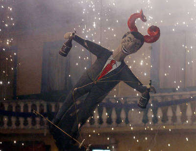 La galería José María Velasco y el colectivo Los Olvidados realizaron ayer, en el barrio bravo capitalino, la tradicional quema de judas del Sábado de Gloria. La vieja tradición tuvo esta vez nuevos protagonistas, como el gobernador de Puebla, Mario Marín, a quien una turba enardecida juzgó culpable "por pederasta, mal gobernante y peor político", cuya efigie fue atada del cuello y colgada de lo alto, para luego hacerla explotar. En la imagen, un monigote que representa al mandatario poblano a punto de ser consumido por el fuego, en La Merced FOTO Francisco Olvera