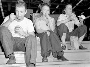 En Inglaterra es como más relajado. Yo trabajé en Manchester desde los catorce años, como obrero de autos y herramientas. Durante siete años gané seis chelines a la semana, hasta la guerra, cuando me fui a la Real Fuerza Aérea, pero no pasé la prueba de los nervios. Entonces fui mecánico aéreo de segunda clase. Una tía mía estuvo en Estados Unidos y se dio cuenta de las posibilidades, y cuando regresó, me dijo: "¡Bert, estás perdiendo el tiempo!" Así que en septiembre me vine para acá. En Inglaterra van derecho al fracaso, están acorralados, les están arrebatando todas las industrias vitales, y no pueden quitar el subsidio, pero si lo quitaran tendrían que asumir las consecuencias. Hay tipos jóvenes que han crecido con el subsidio, y ahora ya no los hacen trabajar. Cuando tienen trabajo provocan que los despidan. El gobierno está entre la espada y la pared. Los animales te muerden cuando les quitas la comida. ¡Para como hacen las cosas en Inglaterra, es un milagro que salgan adelante!