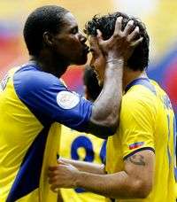 Agustín Delgado, delantero de Ecuador, manifiesta su alegría a Iván Kaviedes, quien marcó el tercer gol para los sudamericanos