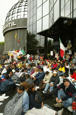 Sentón frente a las instalaciones de la Bolsa de Valores de integrantes del plantón permanente de la Coalición Por el Bien de Todos en Ciudad de México, el 3 de agosto de 2006. Foto: José Carlo González/ archivo La Jornada |