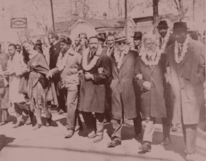 Martin Luther King, flanqueado a la derecha por el dirigente Ralph Bunche de la Organización de las Naciones Unidas, y entrelazado con varios líderes de la lucha por las garantías civiles, en una manifestación en favor del derecho de los negros al registro del voto. Foto Ap |