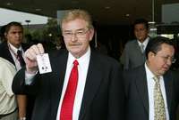 El coordinador de la fracción perredista en San Lázaro, Javier González Garza, muestra su acreditación como diputado
