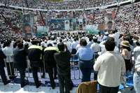 Pero en lo que está por venir, el acto de ayer no dejaba lugar a dudas para los malos augurios: 30 mil personas -¿será un récord?- pasaron rigurosamente por arcos detectores de metales y una a una sus bolsas fueron revisadas, pues así lo advertían grandes mantas colocadas cerca de las puertas del coso.
