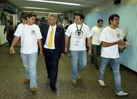 Acompañado por sus hijos, Andrés Manuel López Obrador camina por el pasaje Zócalo-Pino Suárez del Metro, luego de que la convención nacional democrática lo nombró "presidente legítimo de México"
