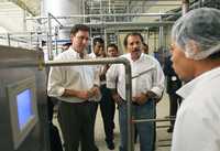 El mandatario electo, Daniel Ortega (centro), y el presidente de Centrolac, Alfredo Lacayo, dialogan con obreros en la planta de Tipitapa