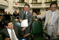 Los diputados locales Víctor Hugo Círigo (PRD), Jacobo Bonilla (PAN) y Sergio Miguel Cedillo del (PRD), durante una de las sesiones de la Asamblea Legislativa