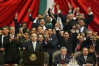 Se les iluminan los rostros. Gritan más fuerte: "¡Mé-xi-co, Mé-xi-co!" Dueños de la mayor parte de la tribuna, los panistas aplauden y aplauden porque acaban de entrar Felipe Calderón y Vicente Fox. No, no todavía. Acaban de entrar los priístas que harán el quórum y darán legitimidad al nuevo Presidente de la República.