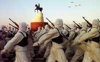 Desfile militar ante una estatua del entonces presidente iraquí, el 31 de diciembre de 2000