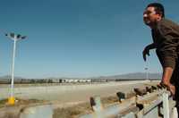 Trepado en la primera de dos bardas que separan a México de Estados Unidos, a la altura de Tijuana, Baja California, el pollero Juan Torres, habla acerca de su actividad, introducir migrantes sin papeles en territorio estadunidense
