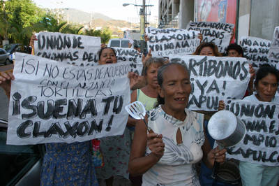 Ayer continuaron las protestas por el aumento al precio de la tortilla: en el puerto de Acapulco, amas de casa salieron a la calle con cartulinas y cacerolas para externar su malestar ante el alza. En la capital, diputados y senadores del PRD convocaron a una marcha el próximo día 16 para exigir la renuncia de Eduardo Sojo, secretario de Economía FOTO J. Guadalupe Pérez