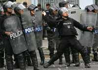 Policías lanzan piedras contra manifestantes a las puertas del Congreso en Quito, en el segundo día de protestas ante la sede del Legislativo como medida de presión para que se apruebe un referéndum sobre una Asamblea Constituyente
