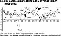 Para apreciar el comportamiento de la economía mexicana en comparación con la estadunidense hemos preparado el Gráfico 3. Como puede observarse, en el periodo de 1991 a 2006 la economía mexicana sigue a grandes rasgos el ciclo estadunidense, aunque con variaciones extremas tanto en las fases de ascenso como de descenso. Esto refleja principalmente dos cosas: 1) la desmedida dependencia-vulnerabilidad de nuestra economía respecto a la del norte, y 2) la incapacidad de nuestros gobiernos para al menos amortiguar los desplomes de la economía con medidas anticíclicas.