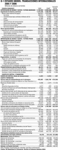 De acuerdo con las cifras de transacciones internacionales dadas a conocer en marzo pasado por BEA (Bureau of Economic Analysis) del Departamento de Comercio de Estados Unidos, la cuenta corriente registró en 2006 un déficit de -856 mil 655 millones de dólares, déficit superior en -65 mil 147 millones al registrado en 2005 (Gráfico 1, ver Memoranda). Las tres balanzas que integran la cuenta corriente se comportaron como sigue: