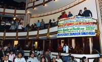 Durante la firma del convenio Tortilla a bajo costo, algunos tortilleros y molineros de Magdalena Contreras protestaron con pancartas por lo que ellos consideran competencia desleal del GDF hacia ellos