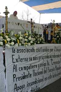 Martín Hernández, integrante de la organización Servicios de Asesoría para la Paz (Serapaz), leyó en la ceremonia el mensaje del obispo de Saltillo, Coahuila, donde dice estar al tanto de los abusos cometidos por las autoridades; de la autorización a la empresa española Befesa para construir el confinamiento de desechos tóxicos, y se manifestó “apenado del maltrato” contra quienes luchan por que no se instale la planta.