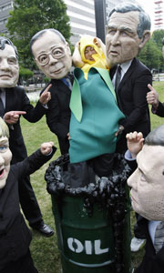 Activistas personificaron a líderes de los ocho países más industrializados del mundo, mientras otro, disfrazado de mazorca, fue colocado en un barril de petróleo durante una manifestación en la ciudad japonesa de Sapporo. En la cumbre de las potencias, realizada en Toyako, en la isla de Hokkaido, la discusión se ha centrado en las alzas desmedidas en hidrocarburos y alimentos. Mandatarios africanos invitados al encuentro demandaron a naciones ricas que cumplan con sus promesas de ayuda a ese continente Foto Reuters