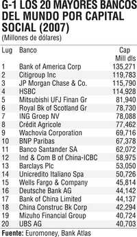 De acuerdo con su capital, el mayor grupo bancario del mundo es el Bank of America (135 mil millones de dólares), seguido del Citigroup y JP Morgan Chase, los tres estadunidenses; en cuarto lugar está el Hong Kong Shangai Bank (HSBC) de control inglés, y en quinto el japonés Mitsubishi (Gráfico 1).