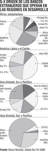 Cada región en desarrollo presenta una participación diferenciada de los bancos internacionales (Gráfico 3). En el caso de América Latina los bancos más agresivos son los españoles con 40% de participación, seguidos de otros europeos (22), estadunidenses (21), canadienses (7) y de otros países (10%).