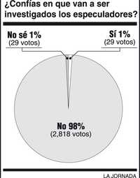 ¿Tienes confianza en que van a ser investigados y, eventualmente, castigados los especuladores que están vaciando las reservas internacionales del Banco de Méxco? Casi unánimemente (98 por ciento), los mexicanos que encuestamos esta semana opinan que no. Una minoría (uno por ciento) cree que sí, y el otro uno por ciento no sabe lo que finalmente sucederá.