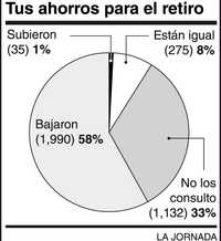En un sondeo que realizamos esta semana entre 3 mil 432 personas, 67 por ciento dijo que tiene una cuenta de ahorro para el retiro. En este universo de clientes, 58 por ciento manifestó que sus estados de cuenta reflejan pérdidas, 33 por ciento admitió que no los consulta y sólo 1 por ciento cree que subieron sus saldos.
