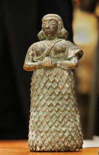 En la imagen, estatuilla de bronce que representa a una diosa mesopotámica, saqueada hace algunos años de Irak. El director de antigüedades de Egipto, Zahi Hawass, explicó que un egipcio que trabajaba en Jordania fue sorprendido en el puerto de Nuweiba cuando intentaba introducir de contrabando la figura de 10 centímetros de altura. La pieza fue entregada este domingo al gobierno iraquí