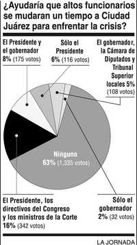 yudaría que el Presidente, los líderes del Congreso y los ministros de la Suprema Corte se mudaran temporalmente a Ciudad Juárez a enfrentar el sangriento caos? En la encuesta de esta semana participaron 2 mil 108 personas de diversas partes de la República. El 63 por ciento no ve ningún beneficio en que los altos funcionarios se apersonen en aquella comarca. El 16 por ciento contestó que quizá conviniera que lo hicieran el Presidente, los directivos del Congreso y los ministros de la Corte. El 8 por ciento piensa que no es necesaria tamaña movilización, bastaría con la presencia del Presidente y el gobernador. El 6 por ciento dice que con el Presidente sería suficiente.