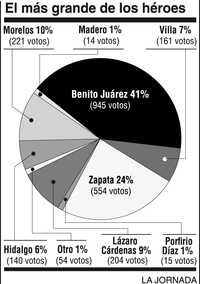 uál es tu héroe favorito? ¿Quién crees que debe ocupar el pedestal más alto entre los héroes de la historia nacional? Ahora que llegamos al centenario y el bicentenario, es momento de hacer una revaluación. Para 41 por ciento de las personas que encuestamos esta semana, el sitio número uno corresponde a Benito Juárez. Le sigue Emiliano Zapata, con 24 por ciento. Y en tercer lugar, José María Morelos, con 10 por ciento. En cuarto sitio, el general Lázaro Cárdenas, con 9 por ciento.