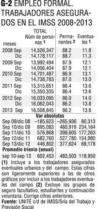 En cuanto al número de trabajadores asegurados en IMSS los primeros nueve meses de los últimos cuatro años, este 2013 ha sido el peor con sólo 447 mil nuevos asegurados (Gráfico 3), el 42% de los empleos mínimos requeridos anualmente (1.05 millones).