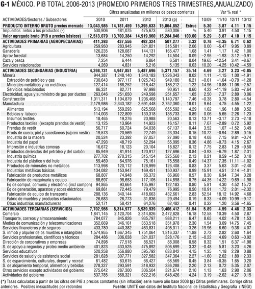 De los sectores industriales, la Minería registra en el período un decrecimiento de -1.91% (incluyendo una baja de -1.28 en la extracción de petróleo y gas); el sector Electricidad, agua y gas por ductos un crecimiento de sólo 0.06%; la Construcción una baja de -4.54; y el sector Manufacturero un crecimiento de 1.22 (Gráfico 1).