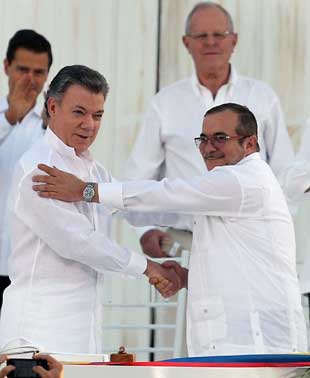 El comité tomó la decisión correcta, opinó Barack Obama, también Nobel de la Paz (2009). En la imagen, el mandatario de Colombia y el dirigente de las FARC, Rodrigo Londoño, Timochenko, sellan con un saludo la firma del acuerdo, el pasado 26 de septiembre en La Habana, Cuba Foto Ap