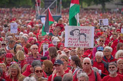 La Haya., Con la consigna de “alto”, más de cien mil manifestantes vestidos de rojo marcharon ayer en La Haya para exigir que el gobierno haga más por detener la ofensiva de Israel en la franja de Gaza, al tiempo que el Fondo de Naciones Unidas para la Infancia (Unicef) denunció que el riesgo de “hambre, enfermedad y muerte” aumenta cada día en en enclave ante el bloqueo israelí.