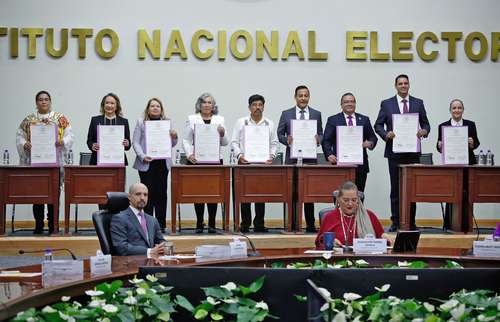 ▲ La presidenta del INE, Guadalupe Taddei, durante la entrega de constancias de mayoría a los ganadores de la elección para ministros de la Corte.Foto Cristina Rodríguez