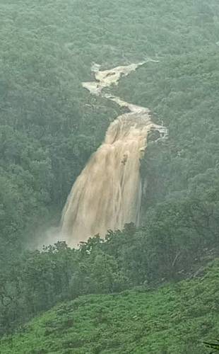▲ Por las torrenciales lluvias aumentó el caudal de una cascada en el ejido Eduardo Benavides, en la sierra tamaulipeca.Foto de la página de Facebook Esto Es Aldama, Tamaulipas, Mex.