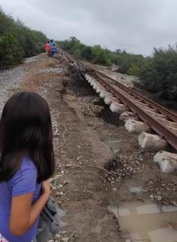 ▲ Un tramo de vía férrea resultó dañado por un deslave provocado por las precipitaciones pluviales, a la altura del poblado de Nuevo Nuevo Quintero, en González, Tamaulipas.Foto tomada de la página de Facebook B7 Noticias