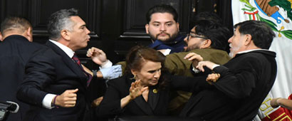 ▲ Luego de que no le fue concedida la palabra ayer en el cierre de trabajos legislativos, el priísta Alejandro Moreno reclamó y se abalanzó a manotazos sobre el presidente del órgano cameral, el morenista Gerardo Fernández Noroña, lo que desató una trifulca en la que hasta Dolores Padierna resultó jaloneada y recibió un golpe. Foto Cuartoscuro