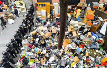 ◀ Policías y golpeadores arribaron ayer a las 6:30 de la mañana a República de Cuba número 11 para desalojar a una decena de familias de 19 departamentos y dos locales. Aunque se justificó el operativo con una supuesta compraventa realizada el año pasado, afectados acusaron que se hizo sin mostrarles una orden ni previo aviso. Además, una reportera de esta casa editorial fue agredida por una uniformada y civiles que la acompañaban. Foto Mara X. Pérez